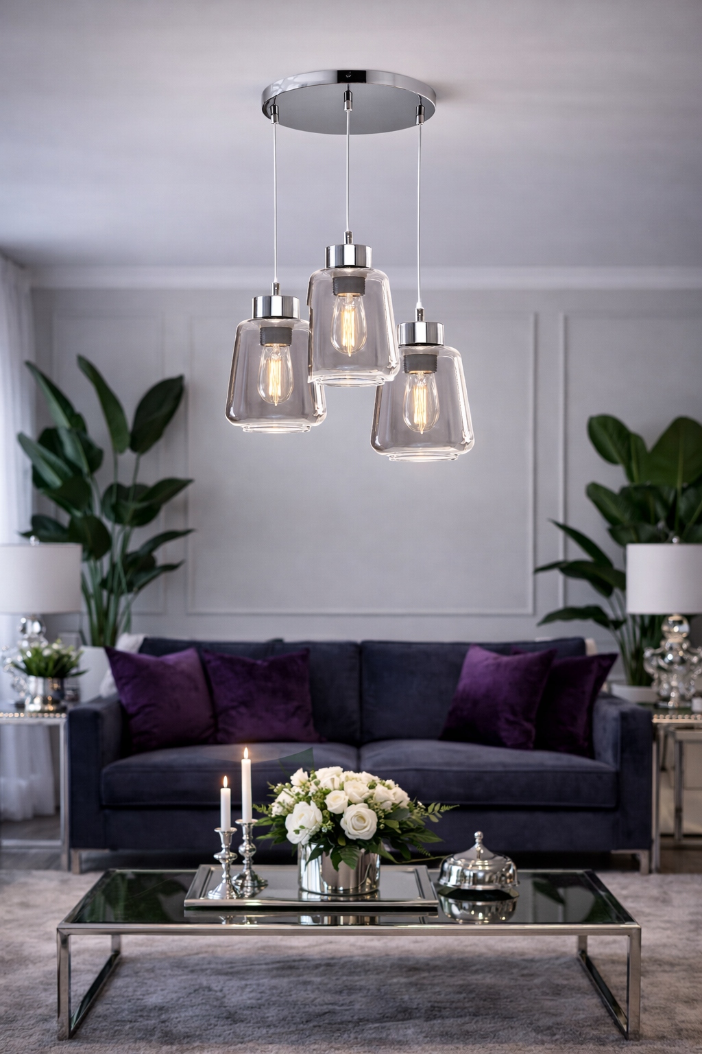 LAMPA WISZĄCA SUFITOWA CRYSTAL CHROME Z TRZEMA SZKLANYMI KLOSZAMI