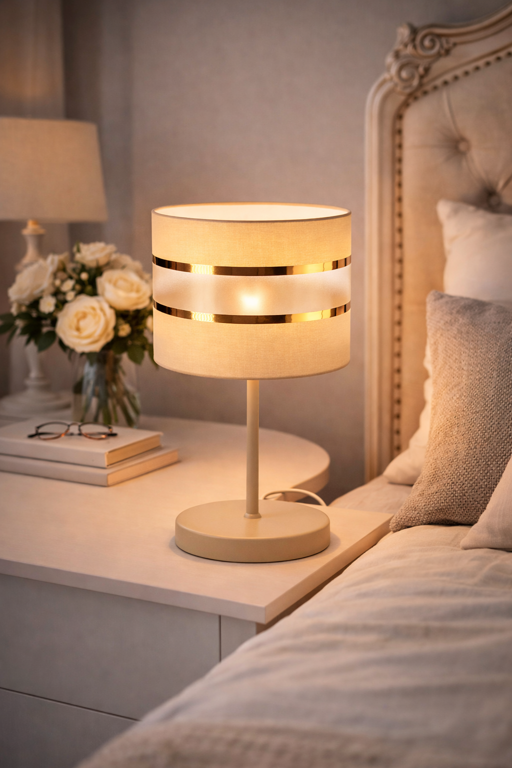 Elegancka lampka nocna z beżowym abażurem ze złotymi paskami z gwintem E27 w czterech kolorach metalowej podstawy do wyboru:
