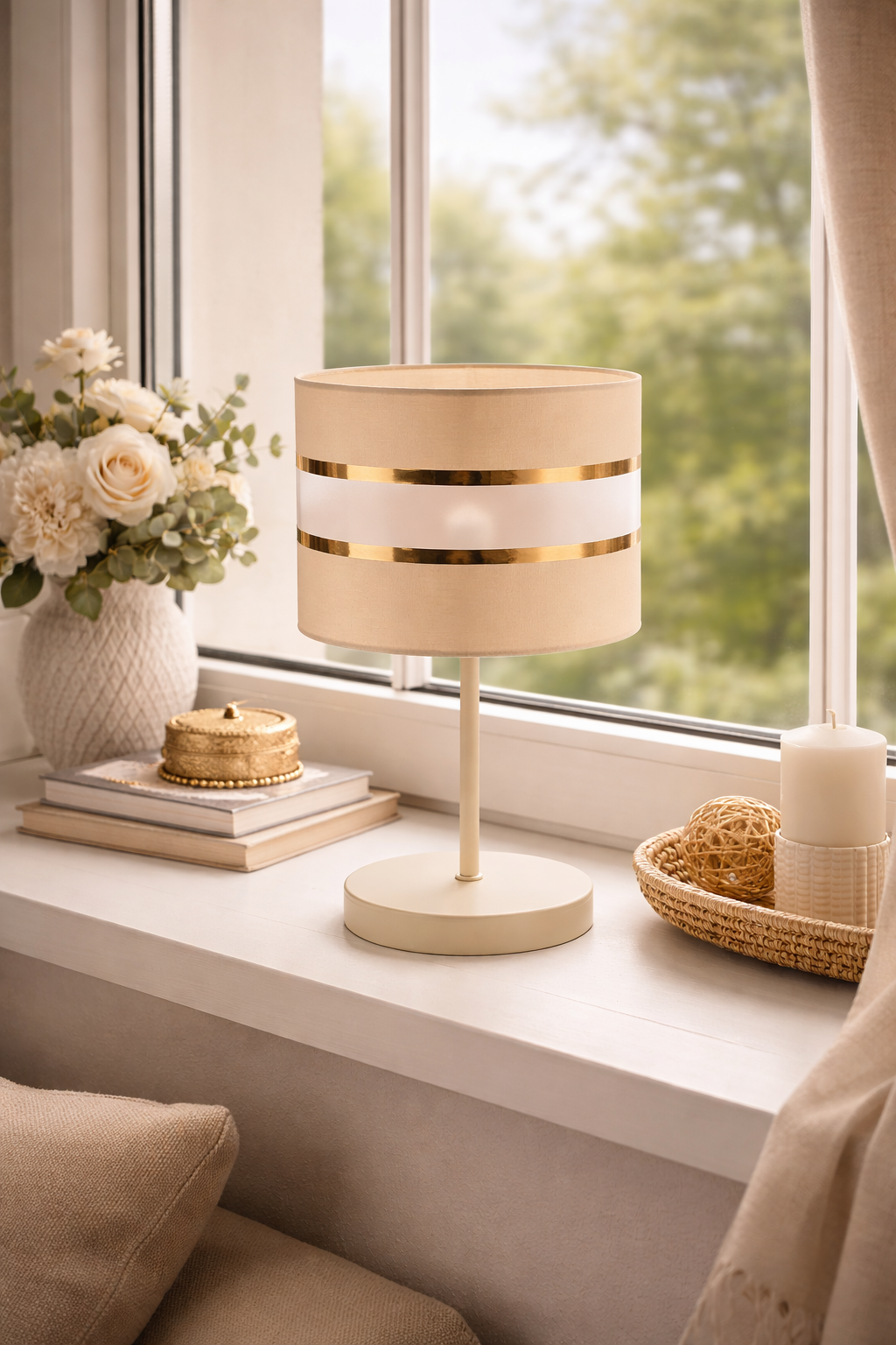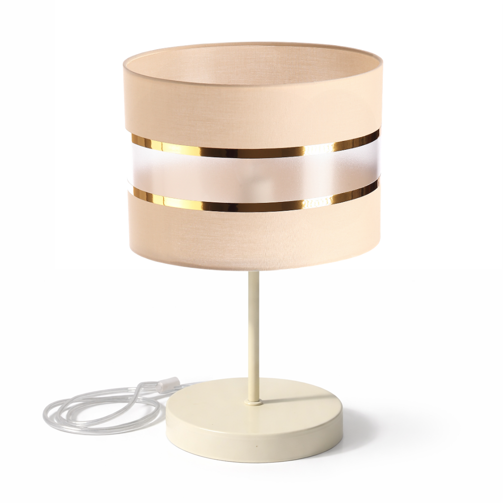 LAMPKA NOCNA STOŁOWA BEŻOWY ABAŻUR ZŁOTE PASY KASZMIR JASNY BEŻ LED E27 DO SALONU